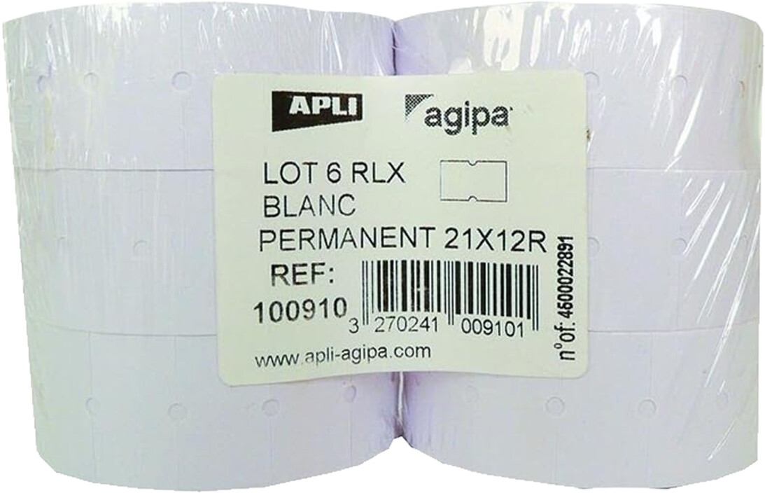 agipa Permanent Etiketten für Preisauszeichner, 21 x 12 mm, Papier, weiß, 6 Rollen, 100910