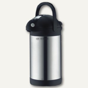 Die Pumpkanne (Isolierkanne) in pflegeleichtem Edelstahl besitzt ein Deckelsystem mit Einhandbedienung!