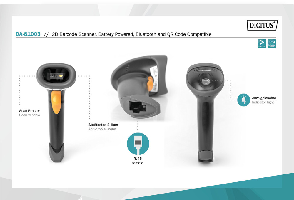 DIGITUS 1D Bar- / 2D QR-Code Handscanner, bidirektional 200 Scans/s, USB-RJ45, Bluetooth, DA-81003