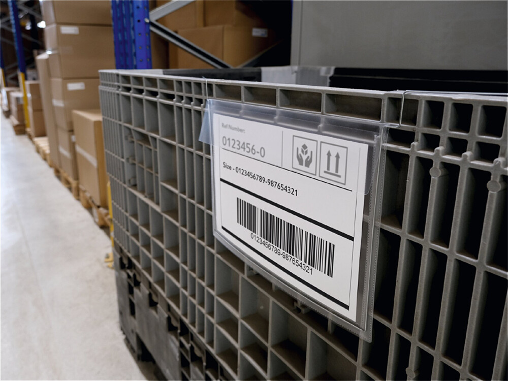 Kennzeichnungstasche mit verzinktem, flexiblen Draht zur leichten und sicheren Fixierung! Für den Einsatz an Transportbehältern, Gitterboxen, Holzaufsatzrahmen und Palettenkartons!