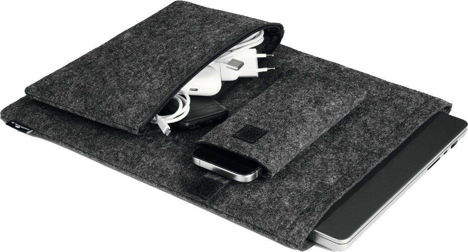 - Schutzhülle für Tablets oder Laptops aus 60 % recyceltem PET-Filz, kombiniert mit zusätzlicher Zubehörtasche