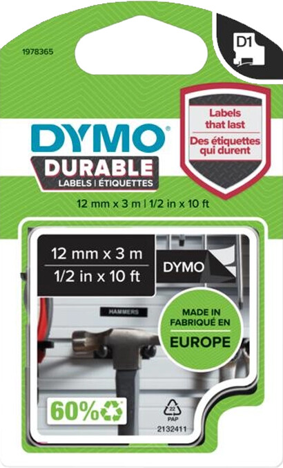 Dymo D1-Schriftbänder High Performance, stark haftend, 12 mm x 3 m, weiß auf schwarz, 1978365