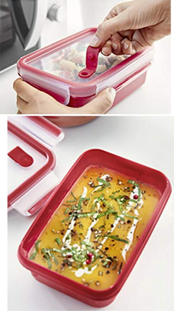 - mit Mikrowellen-Ventil und Clip-Verschluss - einfach mit geschlossenem Deckel in die Mikrowelle stellen und nur das Ventil öffnen