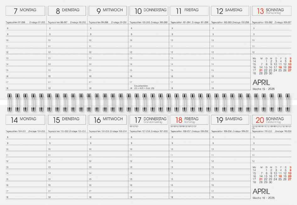 - 2 Wochen auf Vorder- und Rückseite, Sonn- und Feiertage hervorgehoben