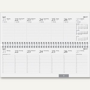| Kalenderaufteilung/Layout | 1 Woche auf 2 Seiten |