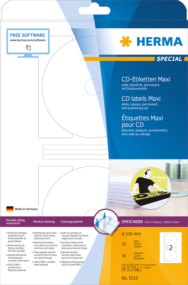 Herma CD-Etiketten Ø116mm, Innenloch 18.5mm, permanent, blickdicht, matt, weiß, 50 St., 5115