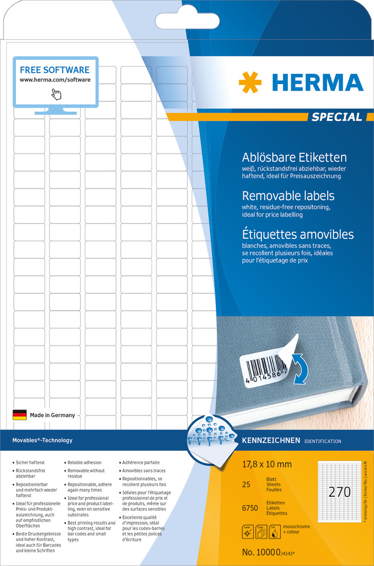 Herma Haftetiketten, 17.8 x 10 mm, ablösbar, weiß, 6.750 St., 10000