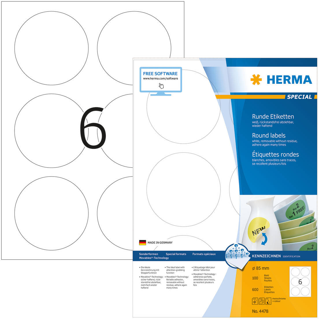Herma Etiketten "Movables", ablösbar, rund Ø 85 mm,weiß, 600 Stück, 4478