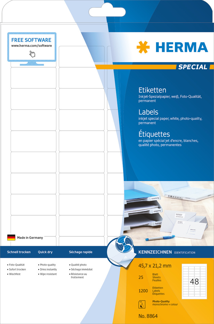 Herma Inkjet-Etiketten A4 - 45.7 x 21.2 mm, permanent, abgerundet, Rand, weiß, 1.200 Stück, 8864