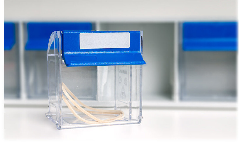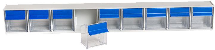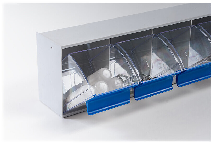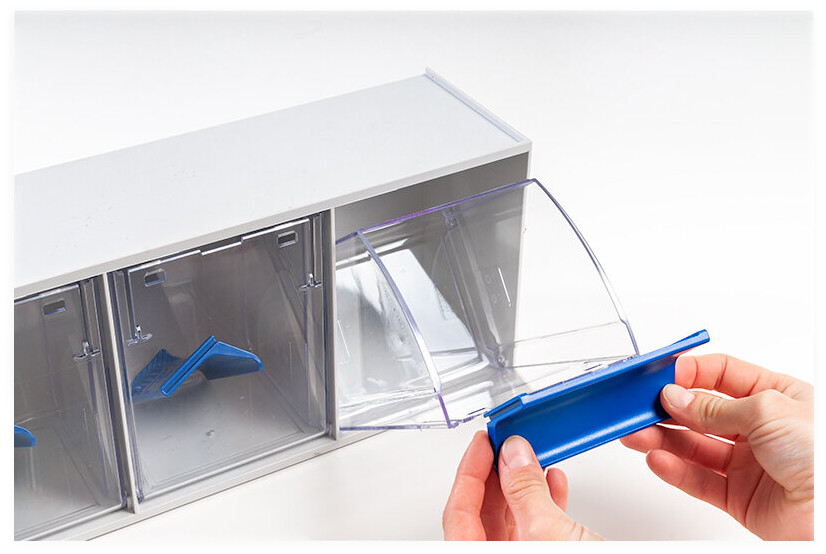 • herausnehmbare Kippschubladen aus glasklarem Polystyrol mit blauem Kunststoffgriff und Etiketten für die perfekte Schubladenbeschriftung