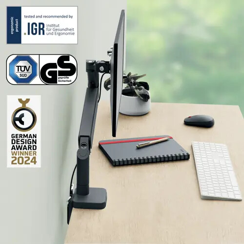 - mitgelieferte abnehmbare Vesa®-Platte (75 und 100 mm) und die silikonbeschichtete C-Klemme (Tischplattenstärke: 10-80 mm)