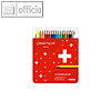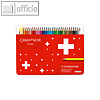 Farbstifte Swisscolor: Die wasserfesten Buntstifte, harmonisch sortiert im roten Metalletui mit schweizer Kreuzmotiven.