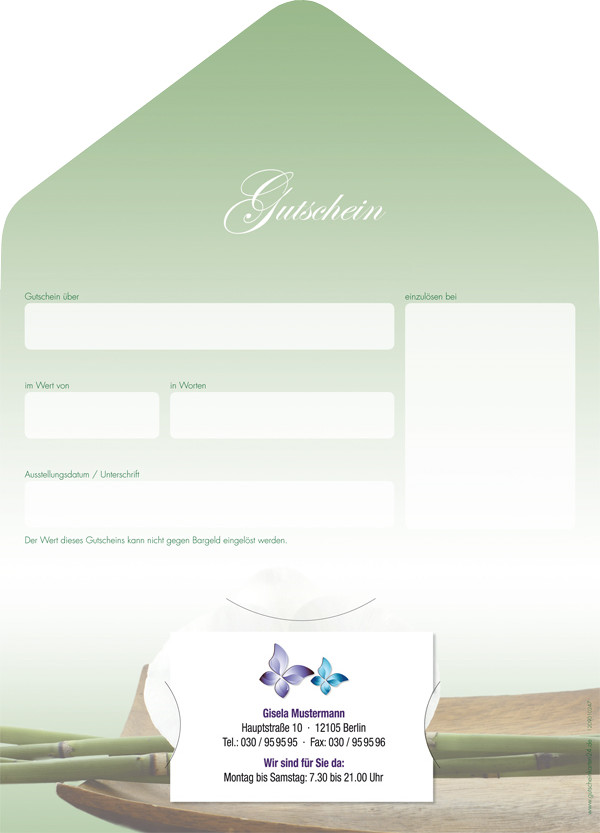 DIE Geschenkidee für Ihre Kunden: Oft weiß man nicht, was man einer geliebten Person schenken soll und greift dann gerne auf einen Geschenkgutschein zurück: Bieten Sie Ihren Kunden die Möglichkeit, Ihre Dienste zu verschenken. Geschenkgutscheine sind sehr beliebt und das beste Cash-Sofort-Leistung-Später-Instrument. Die Gutscheinkarte lässt sich formschön zu einem Kuvert mit Einschublaschen für Ihre Visitenkarte zusammenfalten, die als Werbemittel selbstverständlich nicht fehlen darf.