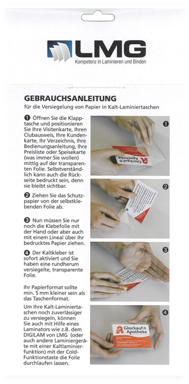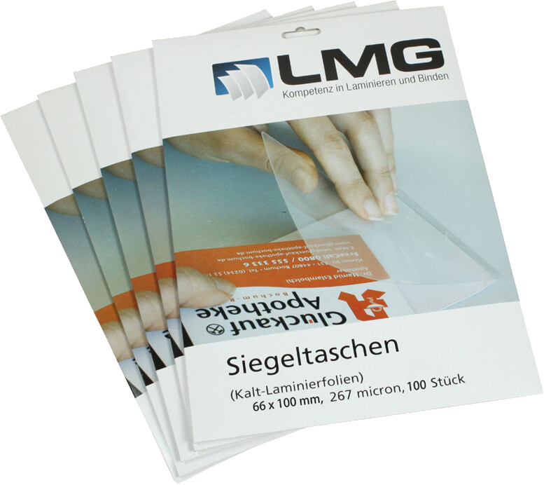 Die LMG Folientaschen zeichnen sich durch höchste Qualitätsgüte und einwandfreie Verarbeitung aus. Bei den LMG Kaltsiegeltaschen ist die Folie mit einem Kleber beschichtet, der normale Klebeeigenschaften bei allen Temperaturen hat. In der Verbindung zwischen Papier und Folie fungiert der Kleber wie ein doppelseitiges Klebeband. Je nach Größe der laminierten Drucke kann das Laminieren ohne eine Laminier- bzw. Kaschiermaschine erfolgen.