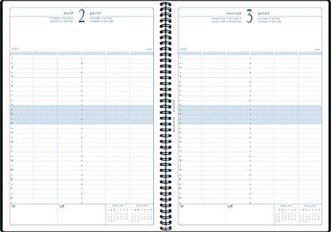 Kalendarium (weißes Papier) mit Spiralbindung - dadurch liegt der Kalender plan auf der Unterlage / Tisch
