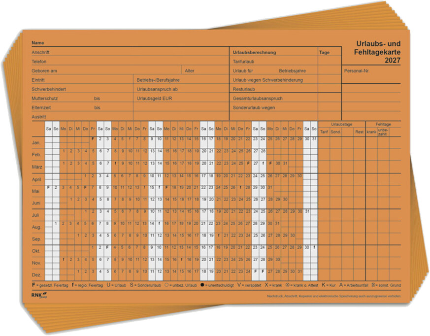 RNK Urlaubs- und Fehltagekarte 2027, A5 quer, tabellarisch/Wochent.100 St.***2027***