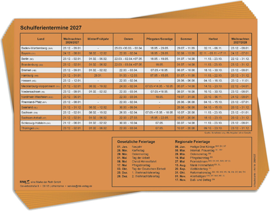 - Schulferientermine für alle Bundesländer auf der Rückseite