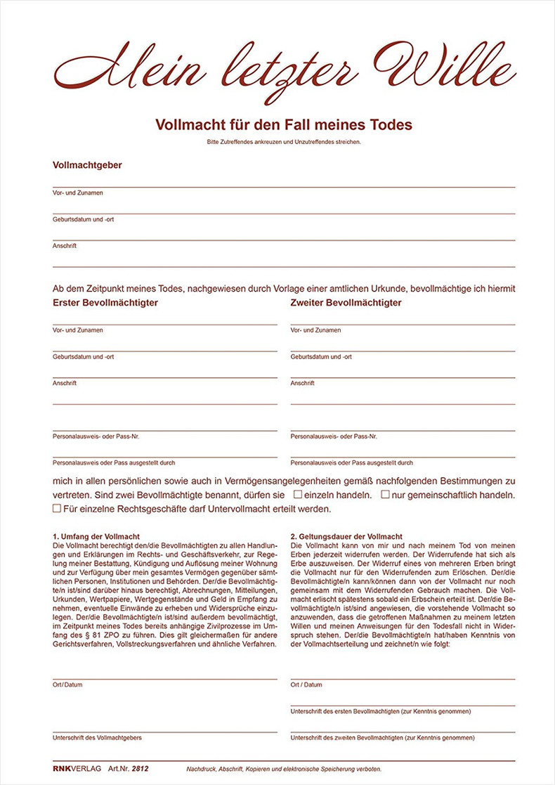 Das handgeschriebene Testament, die Vollmacht für den Todesfall und alle weiteren Verfügungen können übersichtlich und sofort erreichbar in einer dreiteiligen aufklappbaren Mappe aufbewahrt werden!