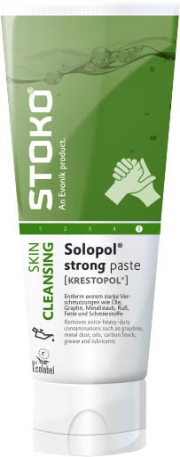 Solopol® strong ist ein pH-hautneutraler Handreiniger mit sehr starker Waschkraft und sehr guter Hautverträglichkeit. Er enthält Aloe Vera, Hautschutzstoff und Rück- fetter. Solopol® strong ist reibemittelhaltig, seifen-, farbstoff-, silikon- und lösemittelfrei.